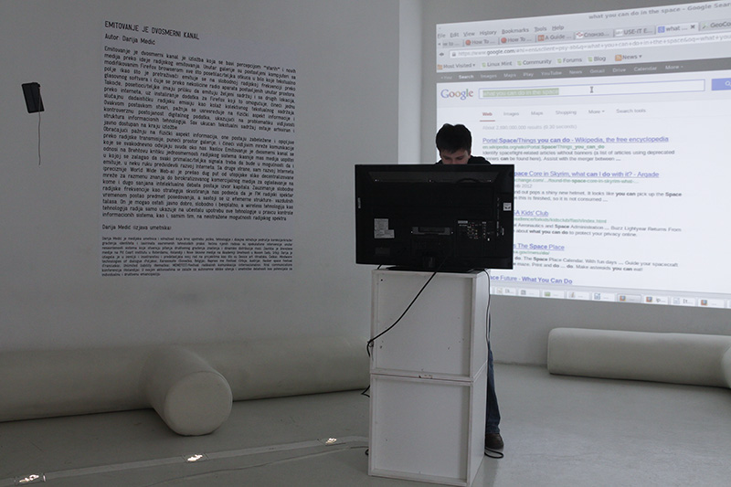 Transmitting is a two way channel deals with the perception of “old” and new media through the concept of radio broadcasting. The work aims to question the social nature of digital information, as well as participative network systems (Internet), that are seen as the opposite to a one directional model of communication tramittion as in old mass media.