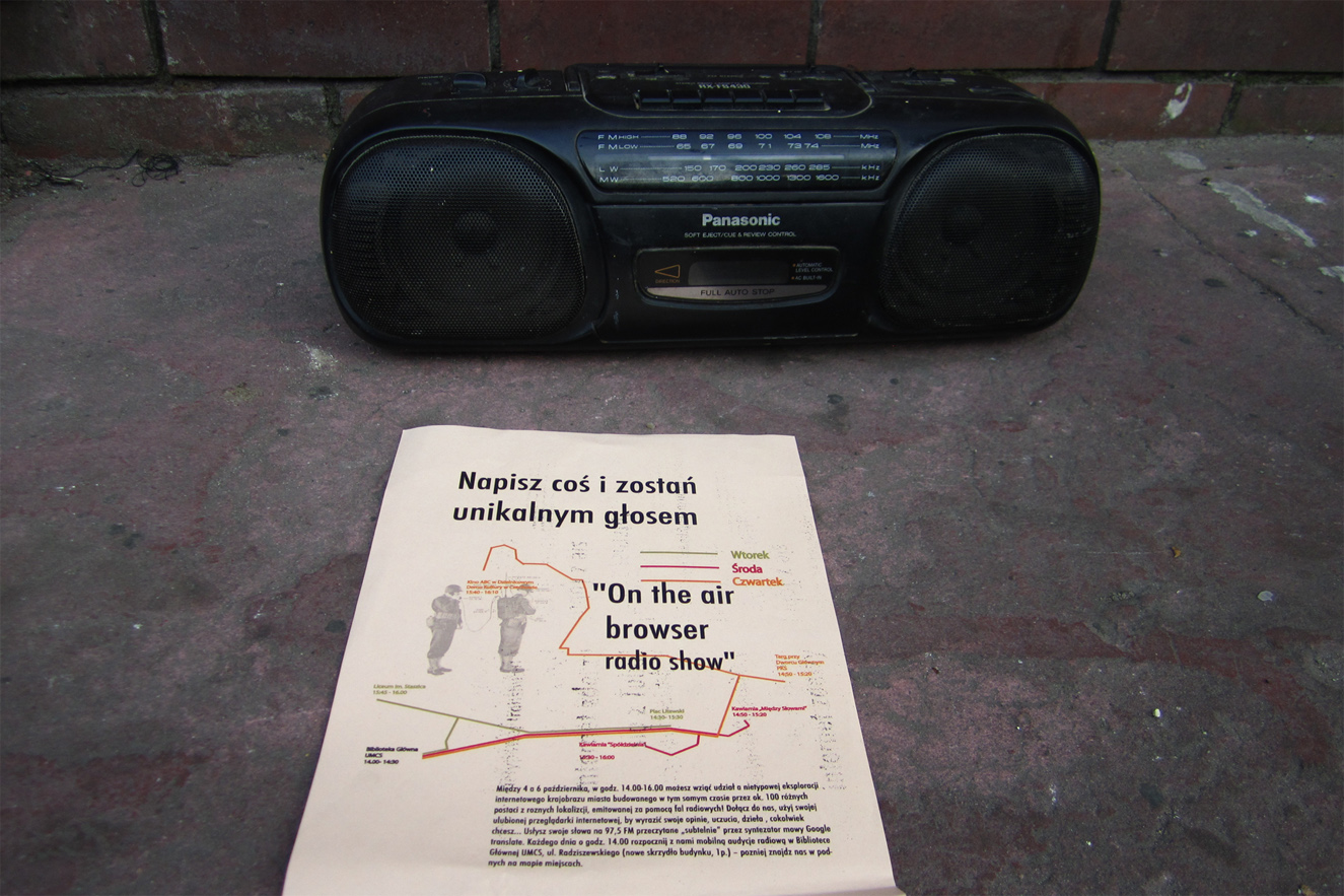 Appropriating a free FM frequency, as a squatting strategy, reminds us that the FM spectrum became a subject of ownership over time, and at the same time consists of an ephemeral structure- air. It could have also stayed a common good, free in both senses of the word, whereas wi-fi technology as a technology of radio is telling of the common use of this technology for the purpose of controlling information systems, as well as, consequently, the unexplored possibilities of the radio spectrum. Documentation of the work on the streets of Lublin, Poland and show in G12HUB